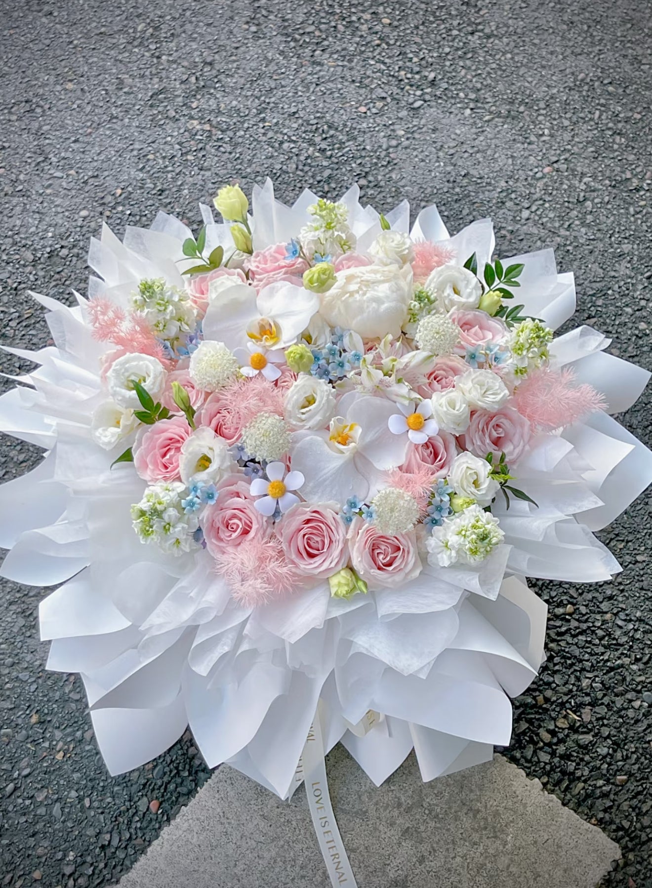 A heart full of dreams and devotion. This exquisite bouquet features a heart-shaped design of blue and white roses, symbolizing purity, sincerity, and everlasting love. Wrapped in soft white layers with pearl accents, it radiates elegance and romance. Perfect for proposals, anniversaries, or simply to say “you are my one and only.”• Main Flowers: White Roses• Shape: Heart-shaped romantic design• Style: Elegant, dreamy, and timeless• Suitable For: Proposal, Anniversary, Valentine’s Day, Romantic SurprisesAll fresh flowers and foliage are seasonal and may be substituted with similar varieties of equal or greater value. Each arrangement is uniquely handcrafted and may vary slightly from the display photo.