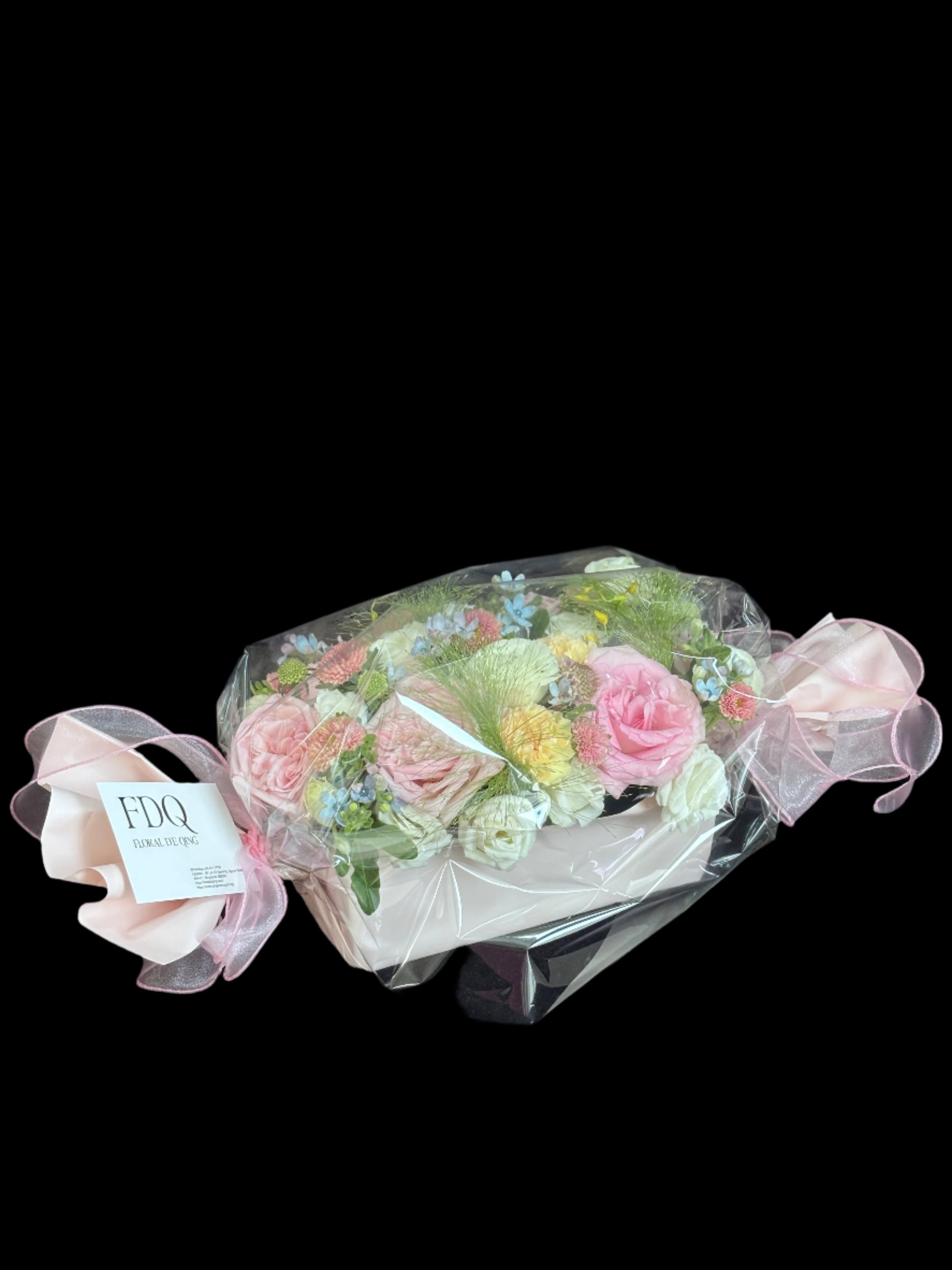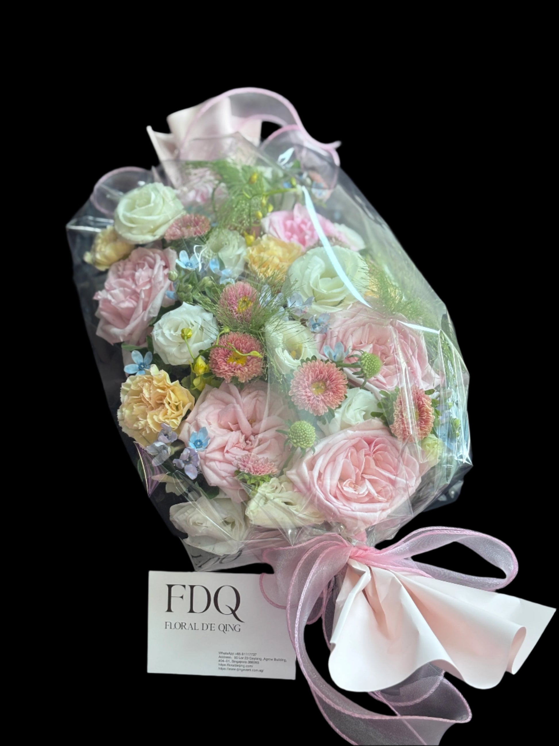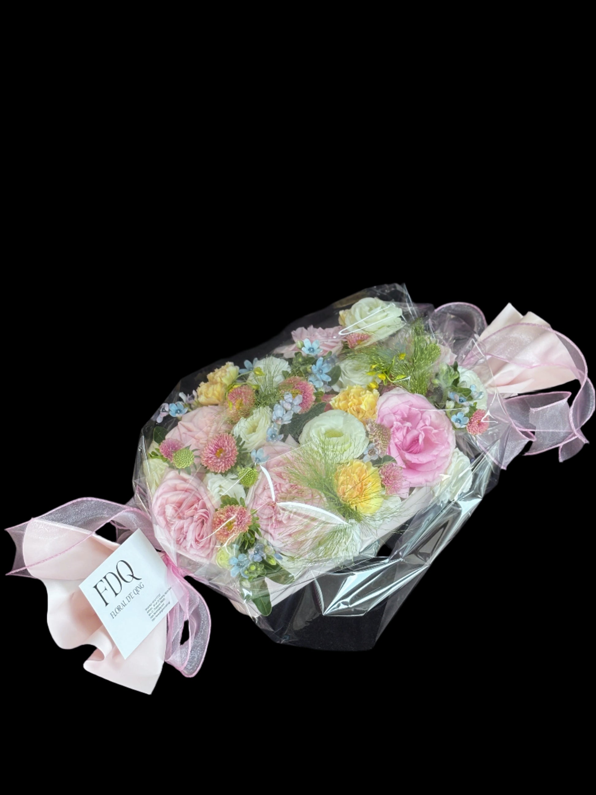 A heart full of dreams and devotion. This exquisite bouquet features a heart-shaped design of blue and white roses, symbolizing purity, sincerity, and everlasting love. Wrapped in soft white layers with pearl accents, it radiates elegance and romance. Perfect for proposals, anniversaries, or simply to say “you are my one and only.”• Main Flowers: White Roses• Shape: Heart-shaped romantic design• Style: Elegant, dreamy, and timeless• Suitable For: Proposal, Anniversary, Valentine’s Day, Romantic SurprisesAll fresh flowers and foliage are seasonal and may be substituted with similar varieties of equal or greater value. Each arrangement is uniquely handcrafted and may vary slightly from the display photo.