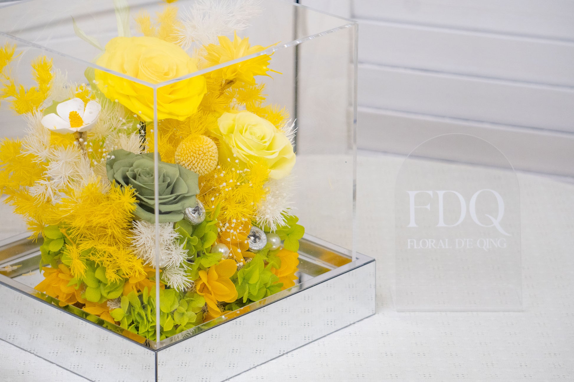 A timeless preserved flower arrangement presented in a crystal-clear acrylic box with a mirrored base.