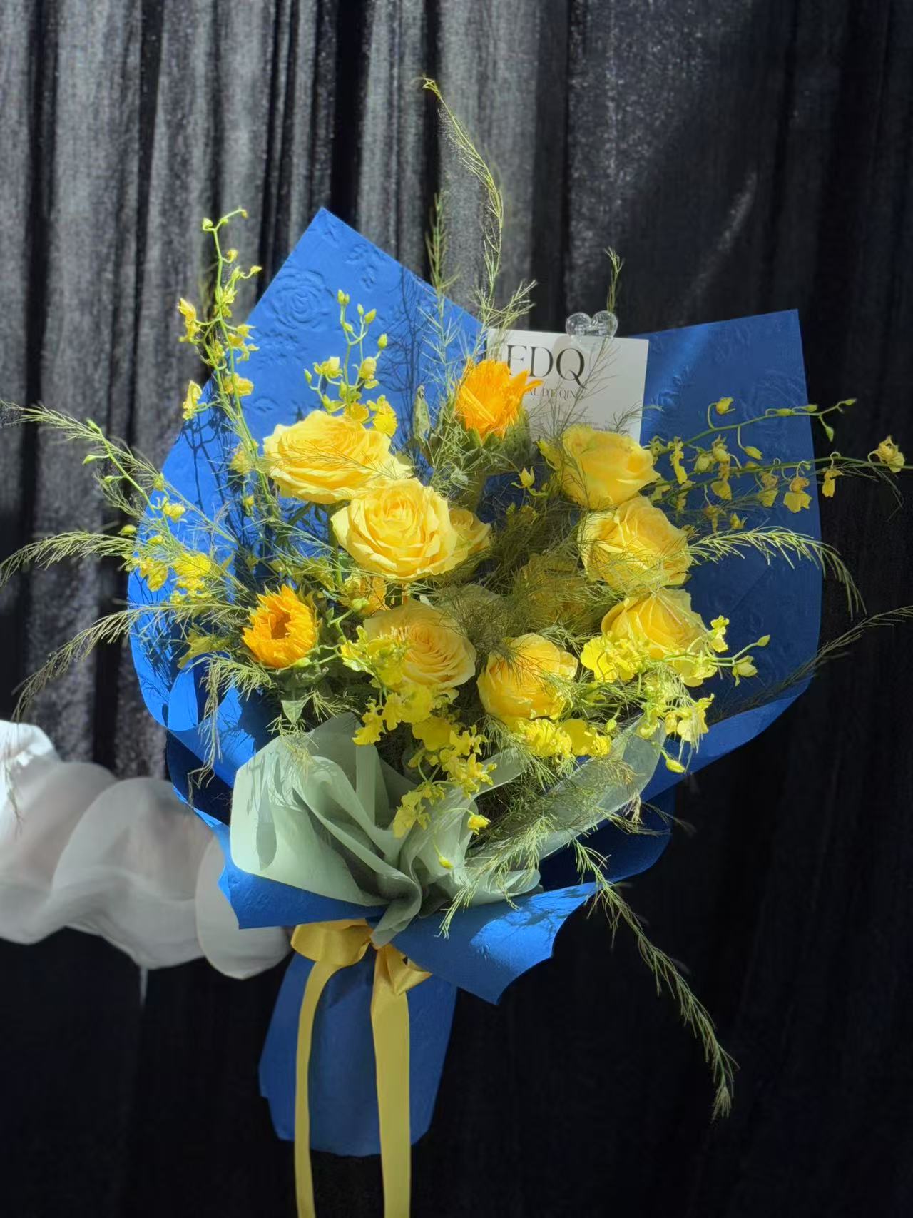 A heart full of dreams and devotion. This exquisite bouquet features a heart-shaped design of blue and white roses, symbolizing purity, sincerity, and everlasting love. Wrapped in soft white layers with pearl accents, it radiates elegance and romance. Perfect for proposals, anniversaries, or simply to say “you are my one and only.”• Main Flowers: White Roses• Shape: Heart-shaped romantic design• Style: Elegant, dreamy, and timeless• Suitable For: Proposal, Anniversary, Valentine’s Day, Romantic SurprisesAll fresh flowers and foliage are seasonal and may be substituted with similar varieties of equal or greater value. Each arrangement is uniquely handcrafted and may vary slightly from the display photo.