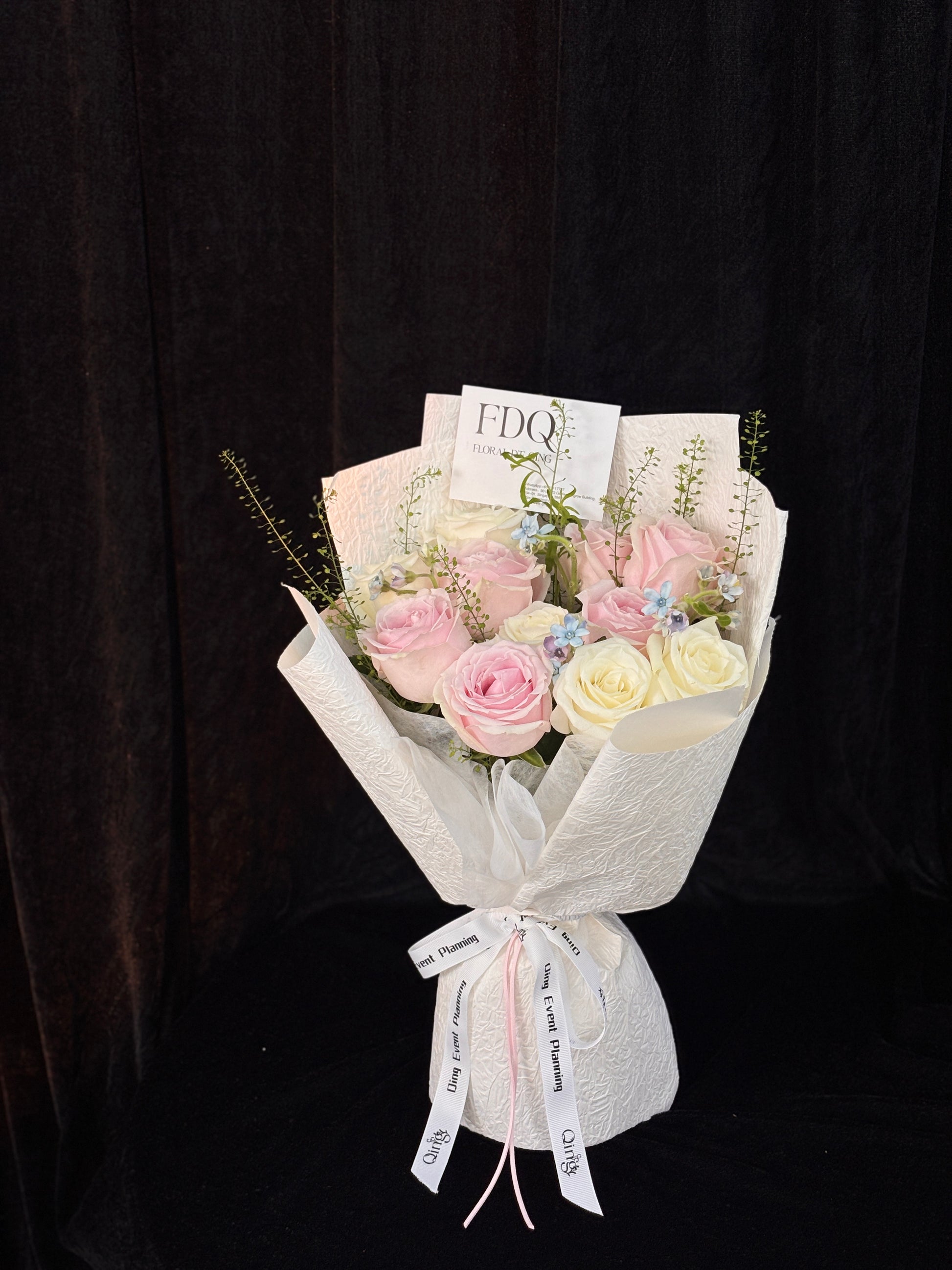 A heart full of dreams and devotion. This exquisite bouquet features a heart-shaped design of blue and white roses, symbolizing purity, sincerity, and everlasting love. Wrapped in soft white layers with pearl accents, it radiates elegance and romance. Perfect for proposals, anniversaries, or simply to say “you are my one and only.”• Main Flowers: White Roses• Shape: Heart-shaped romantic design• Style: Elegant, dreamy, and timeless• Suitable For: Proposal, Anniversary, Valentine’s Day, Romantic SurprisesAll fresh flowers and foliage are seasonal and may be substituted with similar varieties of equal or greater value. Each arrangement is uniquely handcrafted and may vary slightly from the display photo.