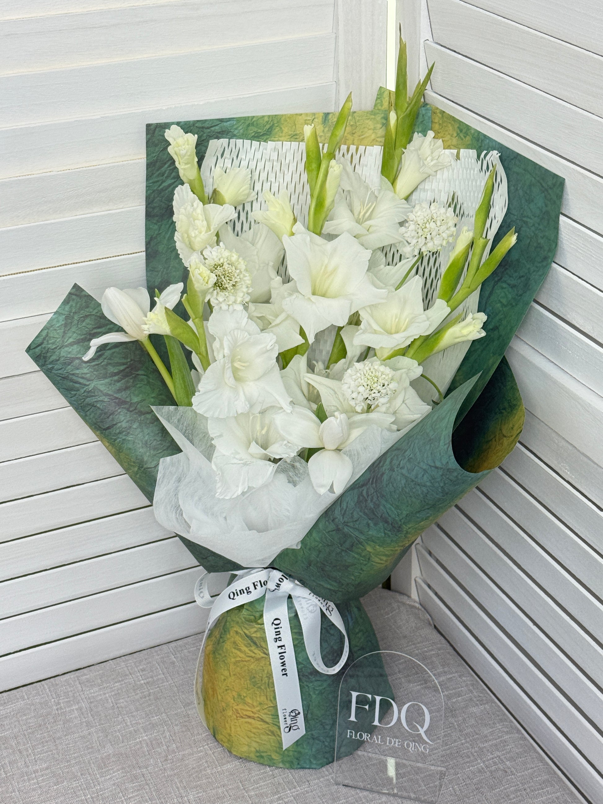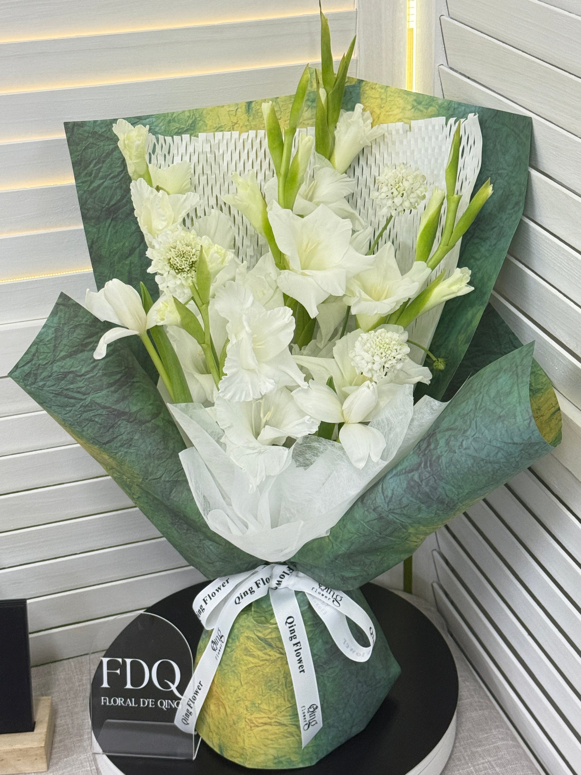 A heart full of dreams and devotion. This exquisite bouquet features a heart-shaped design of blue and white roses, symbolizing purity, sincerity, and everlasting love. Wrapped in soft white layers with pearl accents, it radiates elegance and romance. Perfect for proposals, anniversaries, or simply to say “you are my one and only.”• Main Flowers: White Roses• Shape: Heart-shaped romantic design• Style: Elegant, dreamy, and timeless• Suitable For: Proposal, Anniversary, Valentine’s Day, Romantic SurprisesAll fresh flowers and foliage are seasonal and may be substituted with similar varieties of equal or greater value. Each arrangement is uniquely handcrafted and may vary slightly from the display photo.