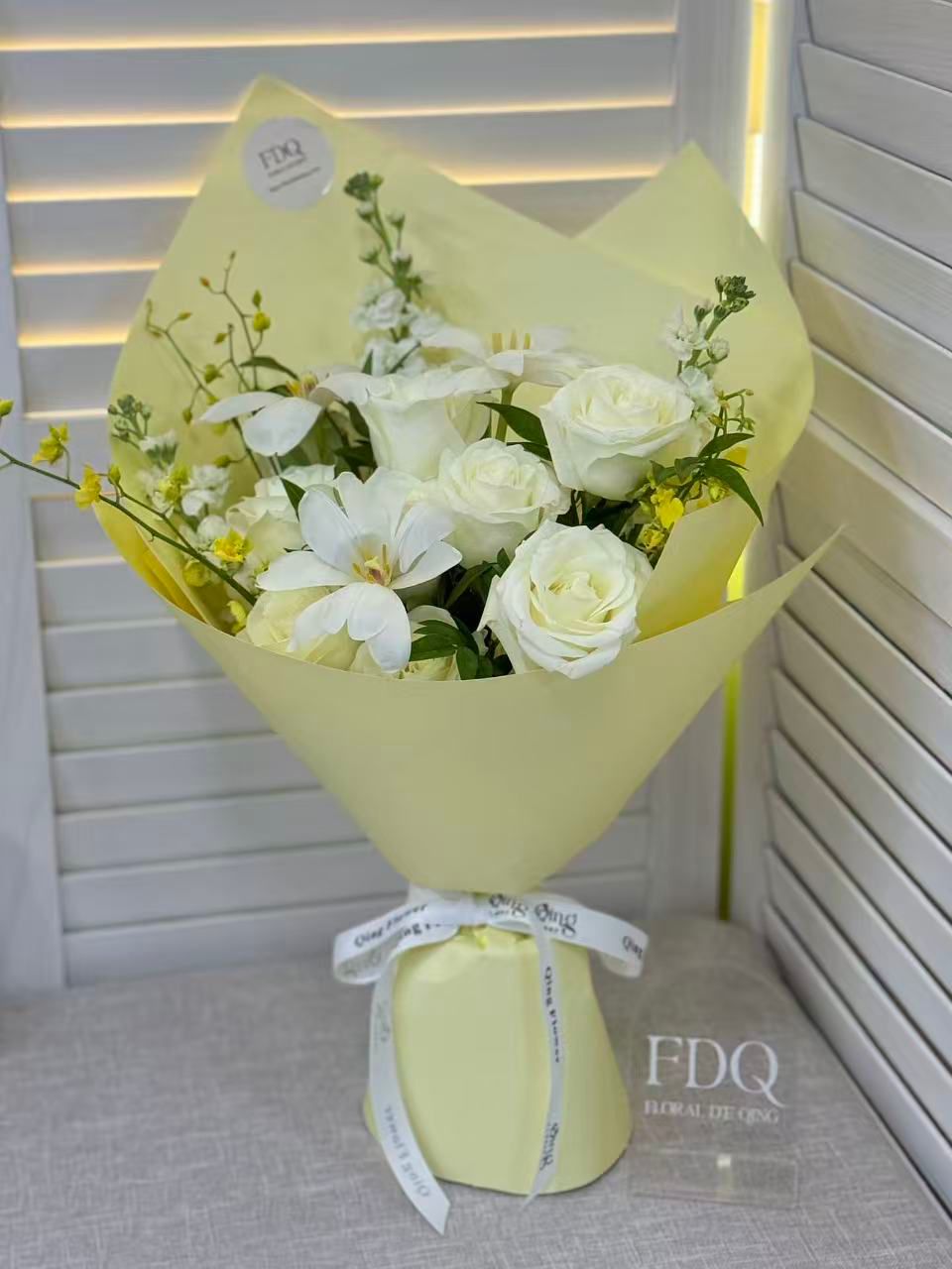A heart full of dreams and devotion. This exquisite bouquet features a heart-shaped design of blue and white roses, symbolizing purity, sincerity, and everlasting love. Wrapped in soft white layers with pearl accents, it radiates elegance and romance. Perfect for proposals, anniversaries, or simply to say “you are my one and only.”• Main Flowers: White Roses• Shape: Heart-shaped romantic design• Style: Elegant, dreamy, and timeless• Suitable For: Proposal, Anniversary, Valentine’s Day, Romantic SurprisesAll fresh flowers and foliage are seasonal and may be substituted with similar varieties of equal or greater value. Each arrangement is uniquely handcrafted and may vary slightly from the display photo.