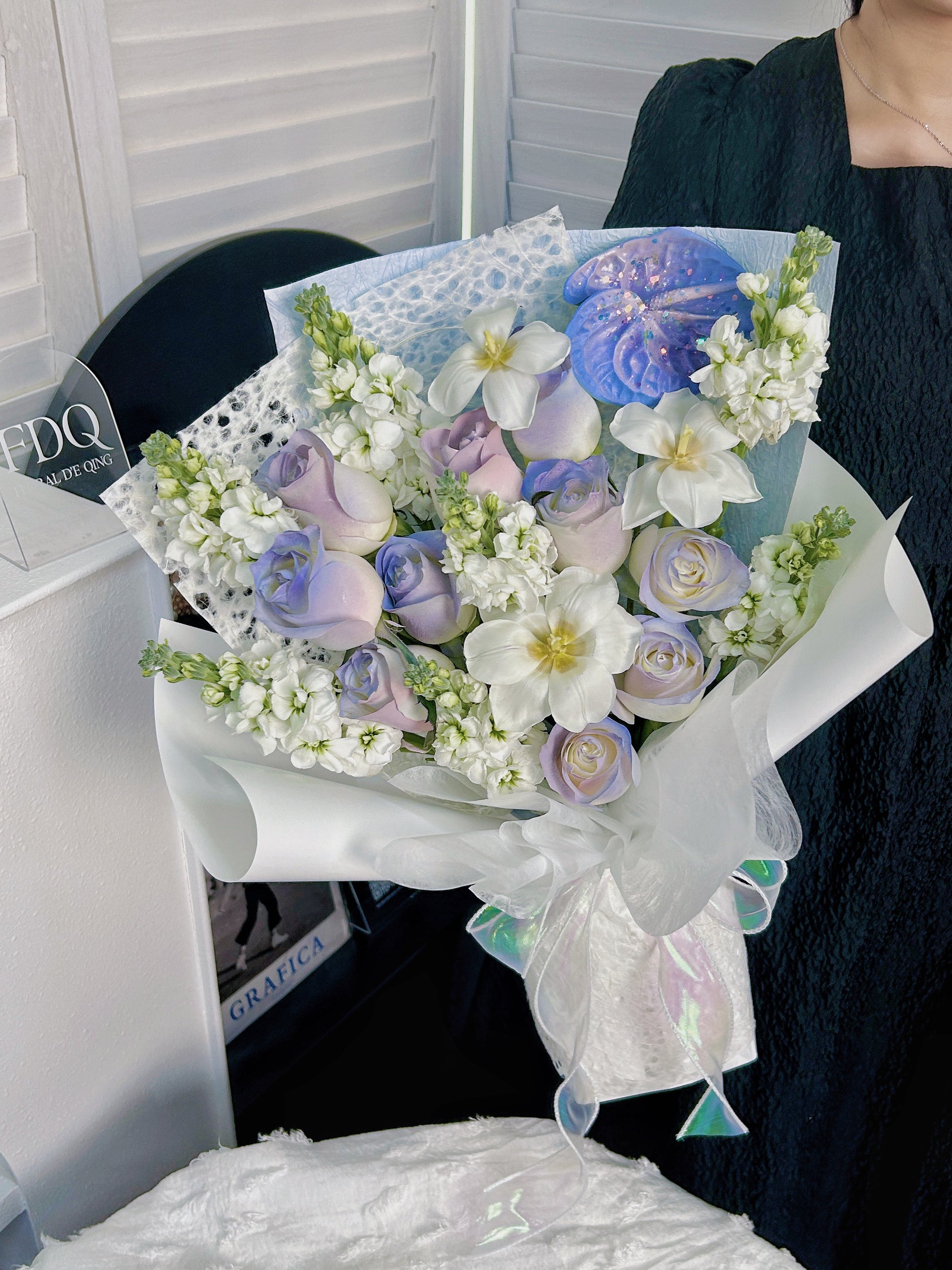A bouquet that blends soft blue and lilac roses, accented with white lilies and delicate fillers. Dreamy and ethereal, perfect for expressing pure love and timeless elegance.