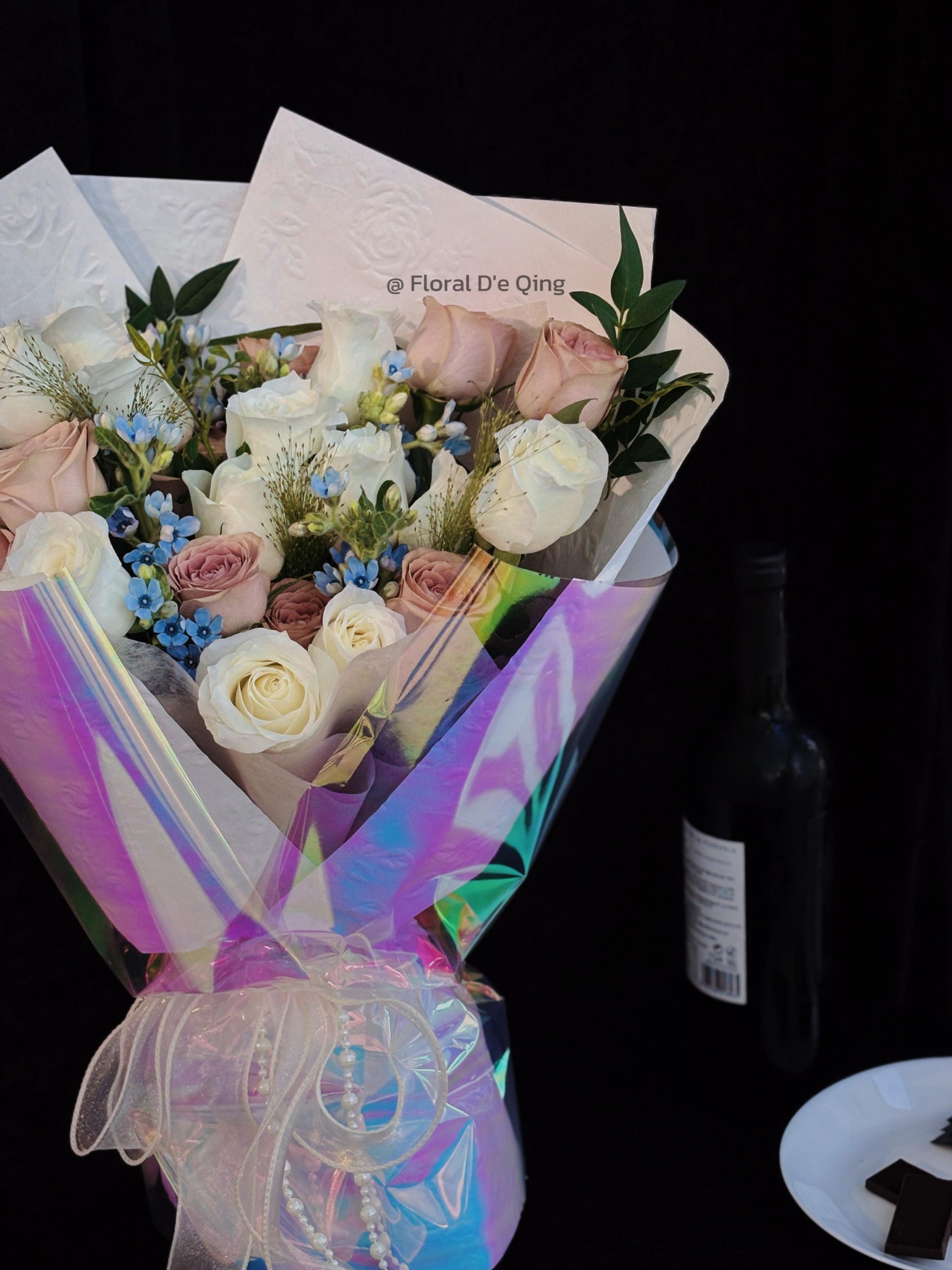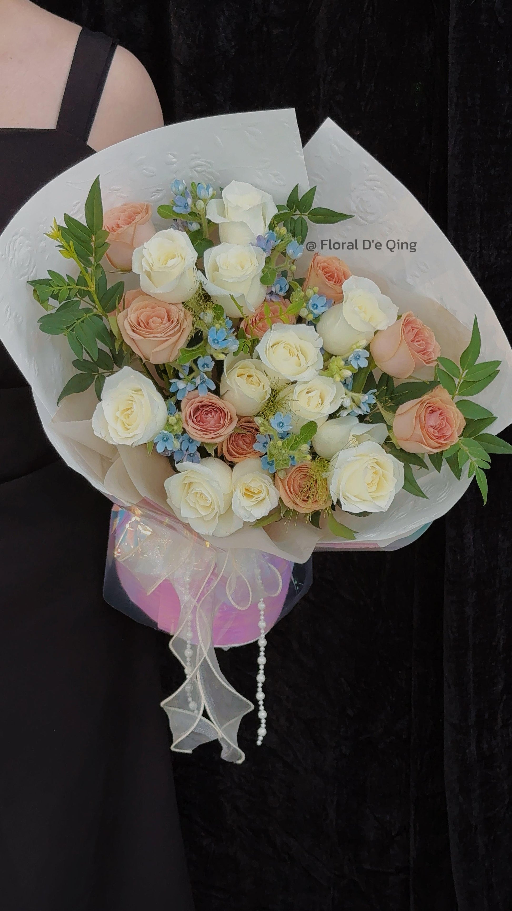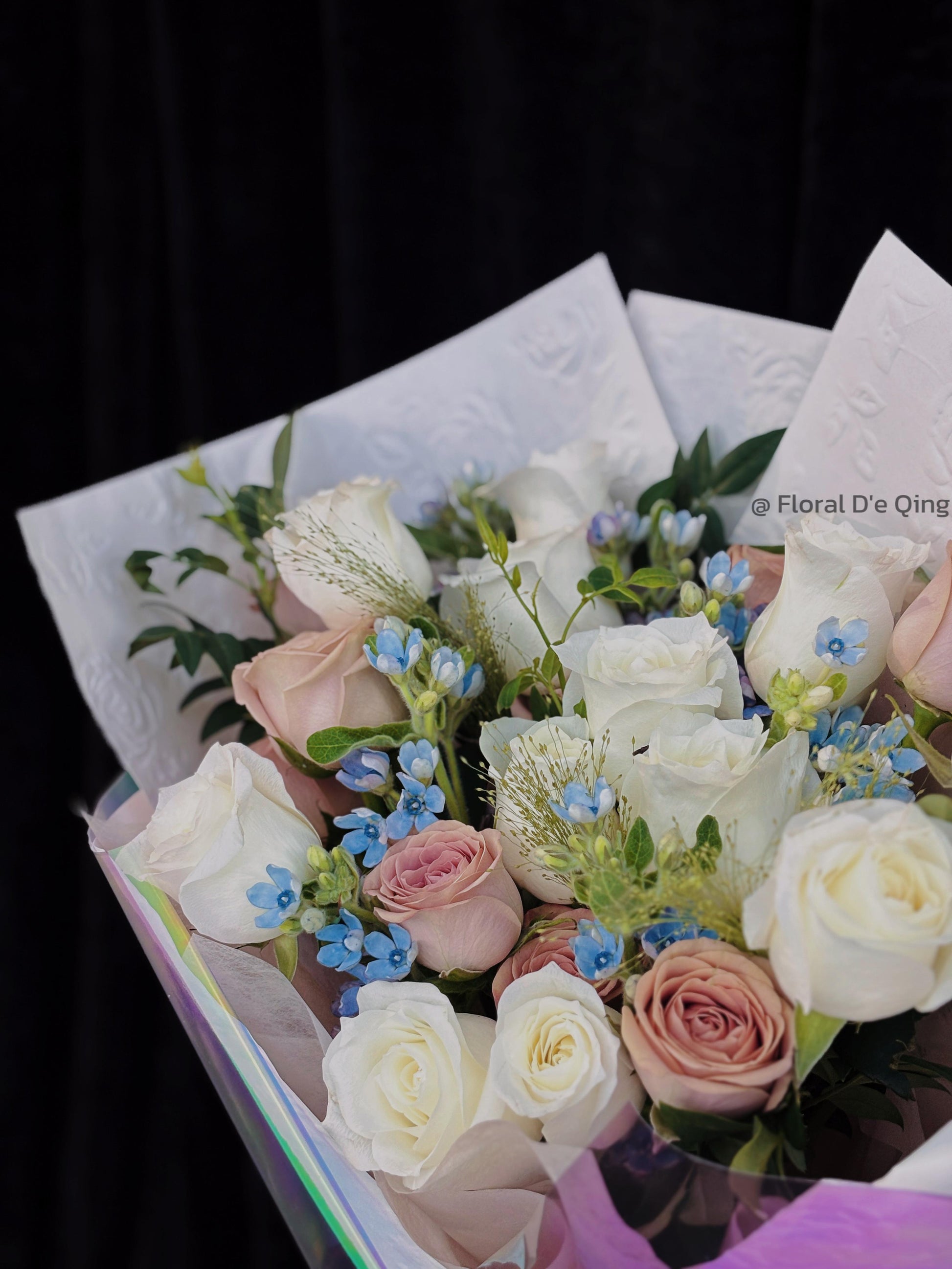 A heart full of dreams and devotion. This exquisite bouquet features a heart-shaped design of blue and white roses, symbolizing purity, sincerity, and everlasting love. Wrapped in soft white layers with pearl accents, it radiates elegance and romance. Perfect for proposals, anniversaries, or simply to say “you are my one and only.”• Main Flowers: White Roses• Shape: Heart-shaped romantic design• Style: Elegant, dreamy, and timeless• Suitable For: Proposal, Anniversary, Valentine’s Day, Romantic SurprisesAll fresh flowers and foliage are seasonal and may be substituted with similar varieties of equal or greater value. Each arrangement is uniquely handcrafted and may vary slightly from the display photo.