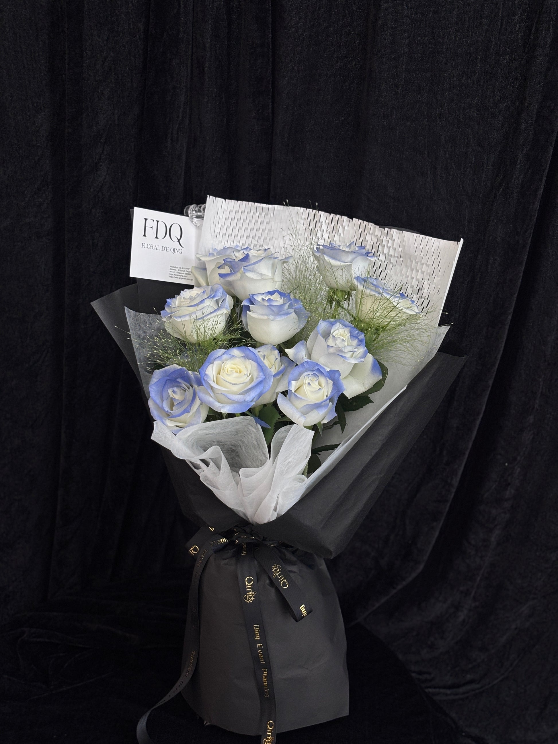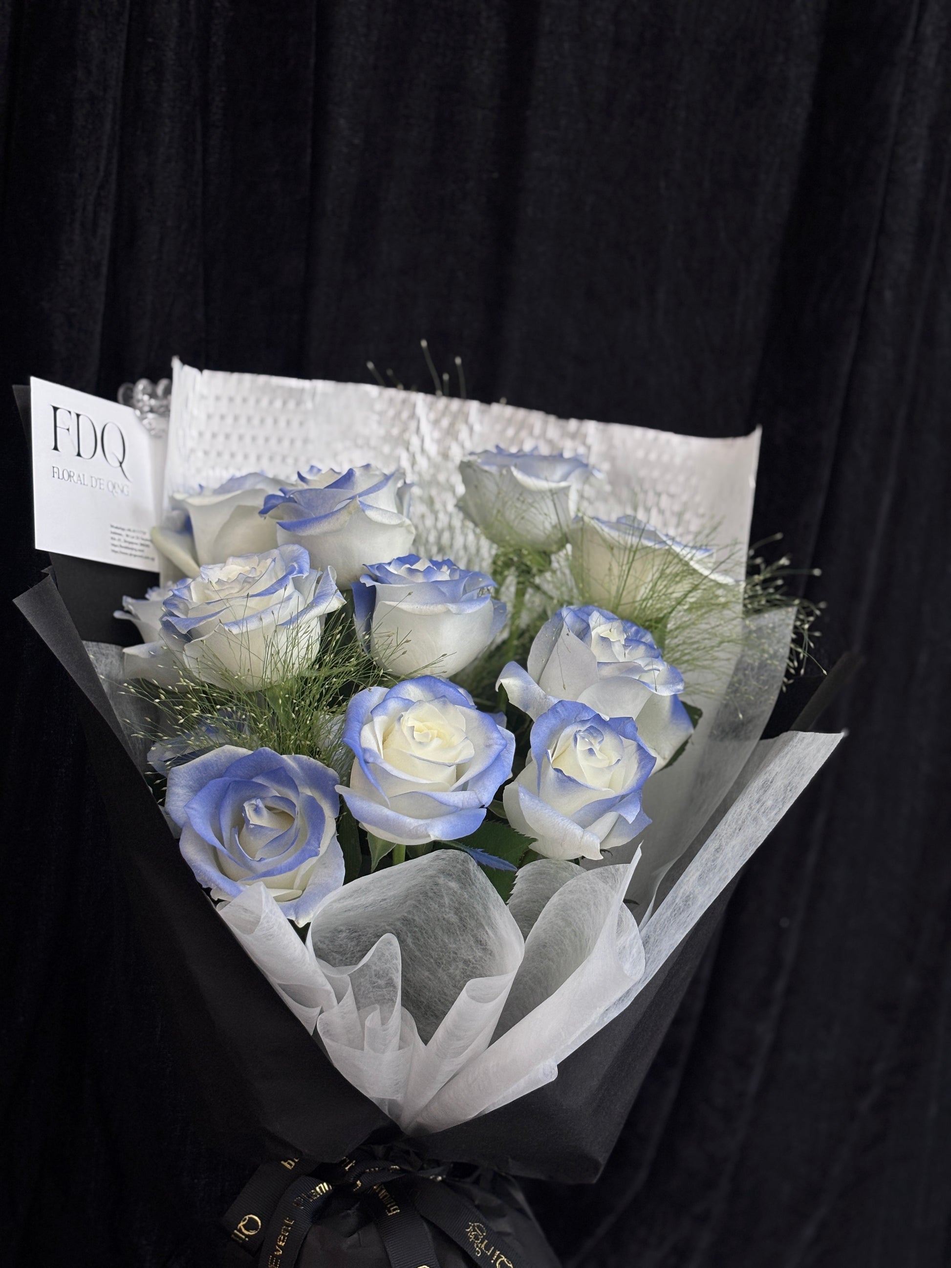 A heart full of dreams and devotion. This exquisite bouquet features a heart-shaped design of blue and white roses, symbolizing purity, sincerity, and everlasting love. Wrapped in soft white layers with pearl accents, it radiates elegance and romance. Perfect for proposals, anniversaries, or simply to say “you are my one and only.”• Main Flowers: White Roses• Shape: Heart-shaped romantic design• Style: Elegant, dreamy, and timeless• Suitable For: Proposal, Anniversary, Valentine’s Day, Romantic SurprisesAll fresh flowers and foliage are seasonal and may be substituted with similar varieties of equal or greater value. Each arrangement is uniquely handcrafted and may vary slightly from the display photo.