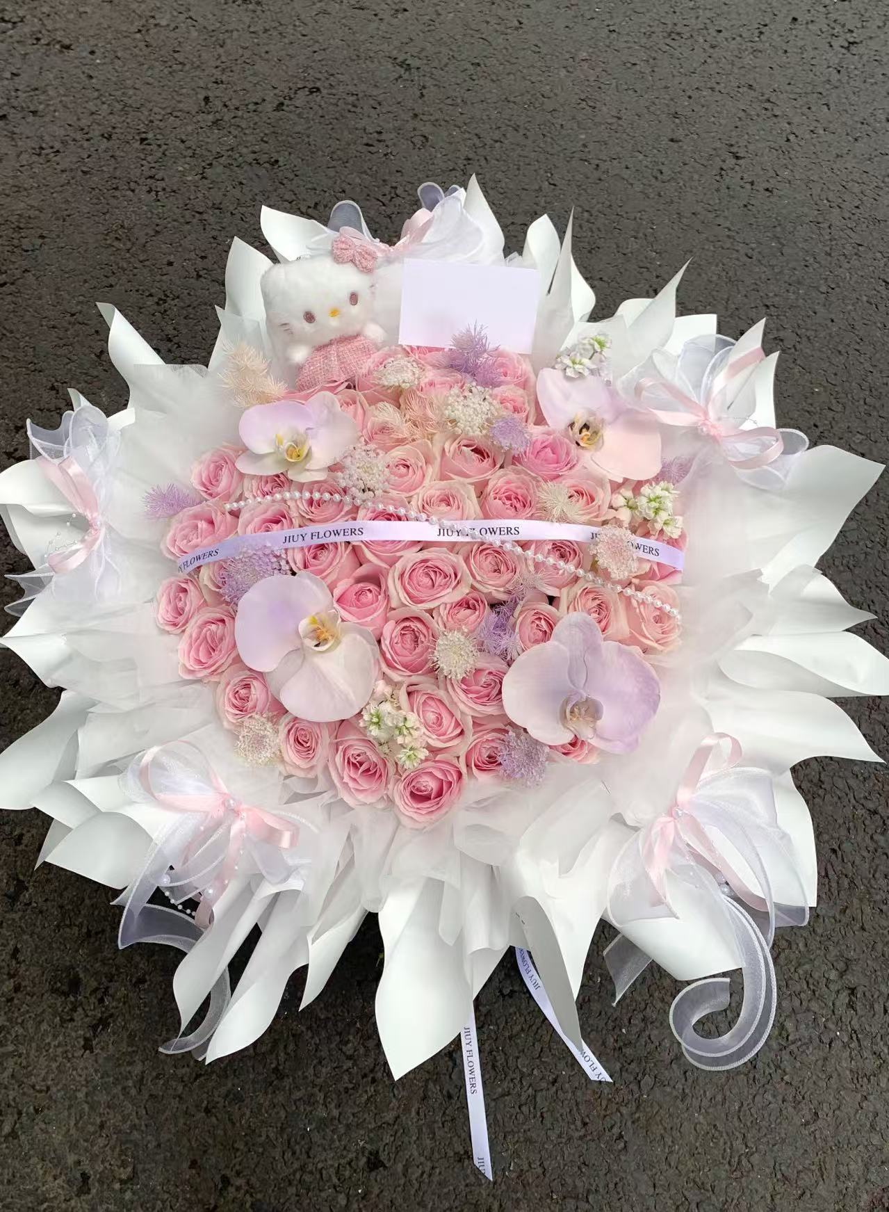 A heart full of dreams and devotion. This exquisite bouquet features a heart-shaped design of blue and white roses, symbolizing purity, sincerity, and everlasting love. Wrapped in soft white layers with pearl accents, it radiates elegance and romance. Perfect for proposals, anniversaries, or simply to say “you are my one and only.”• Main Flowers: White Roses• Shape: Heart-shaped romantic design• Style: Elegant, dreamy, and timeless• Suitable For: Proposal, Anniversary, Valentine’s Day, Romantic SurprisesAll fresh flowers and foliage are seasonal and may be substituted with similar varieties of equal or greater value. Each arrangement is uniquely handcrafted and may vary slightly from the display photo.