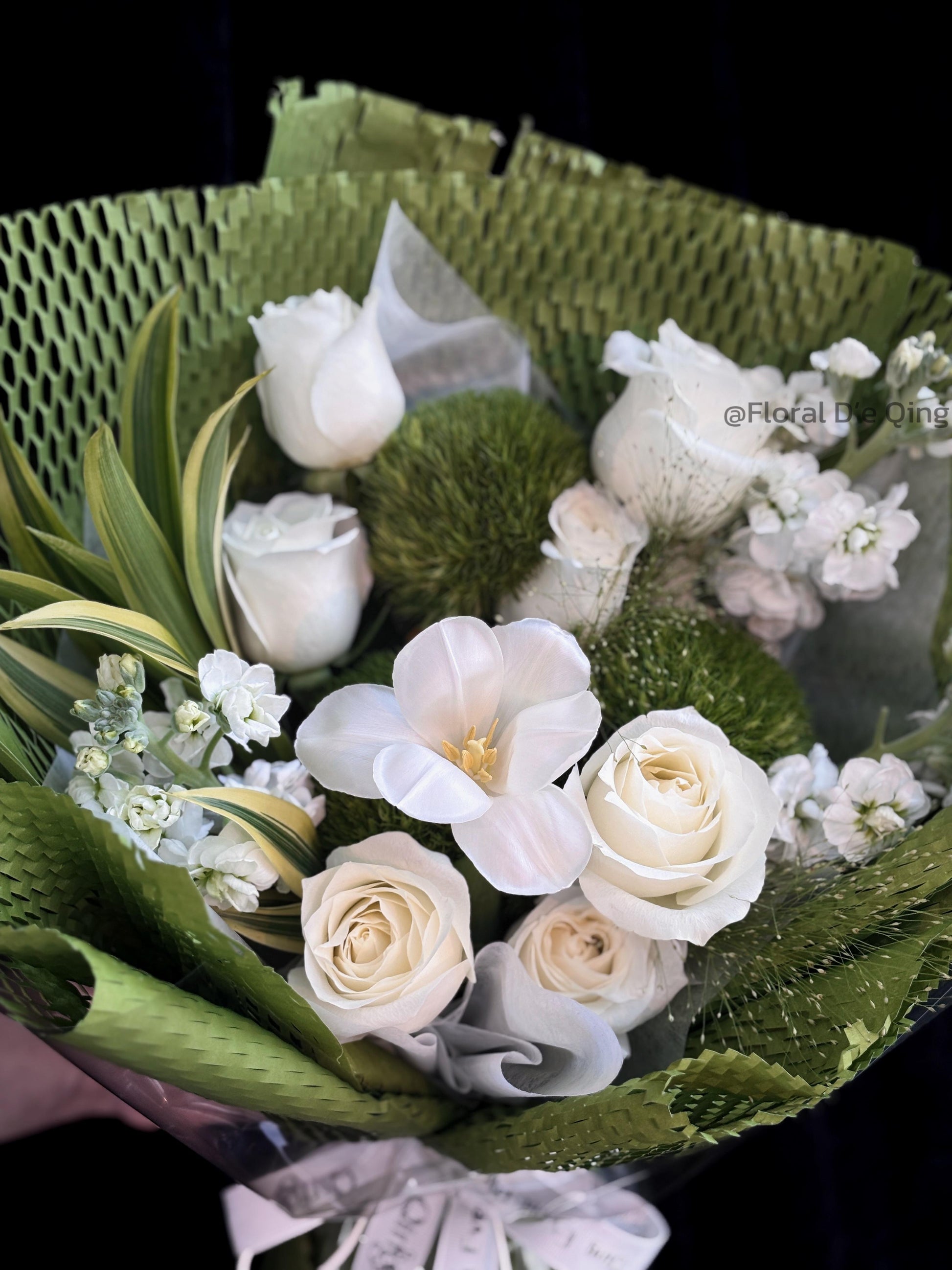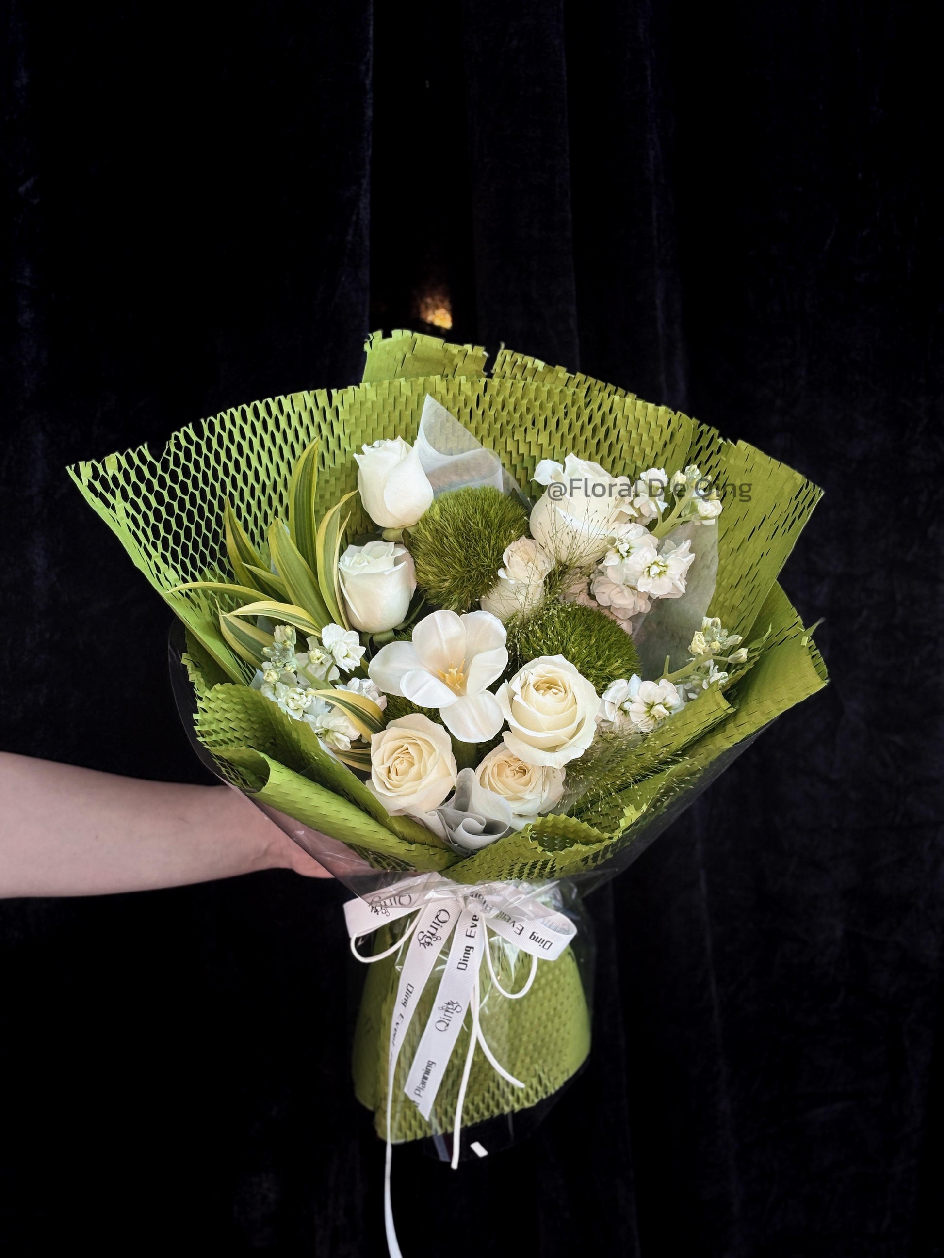 A heart full of dreams and devotion. This exquisite bouquet features a heart-shaped design of blue and white roses, symbolizing purity, sincerity, and everlasting love. Wrapped in soft white layers with pearl accents, it radiates elegance and romance. Perfect for proposals, anniversaries, or simply to say “you are my one and only.”• Main Flowers: White Roses• Shape: Heart-shaped romantic design• Style: Elegant, dreamy, and timeless• Suitable For: Proposal, Anniversary, Valentine’s Day, Romantic SurprisesAll fresh flowers and foliage are seasonal and may be substituted with similar varieties of equal or greater value. Each arrangement is uniquely handcrafted and may vary slightly from the display photo.