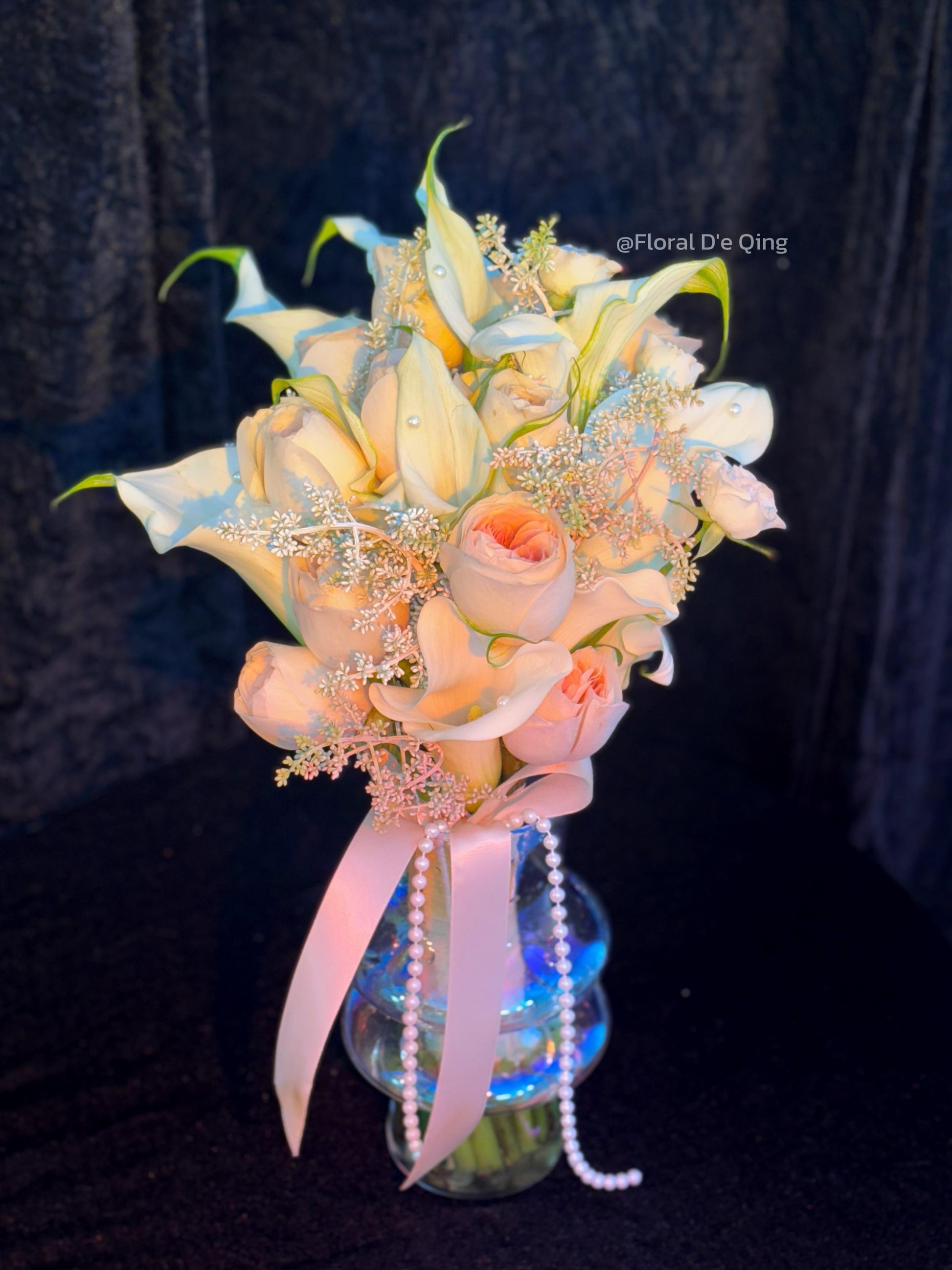 A heart full of dreams and devotion. This exquisite bouquet features a heart-shaped design of blue and white roses, symbolizing purity, sincerity, and everlasting love. Wrapped in soft white layers with pearl accents, it radiates elegance and romance. Perfect for proposals, anniversaries, or simply to say “you are my one and only.”• Main Flowers: White Roses• Shape: Heart-shaped romantic design• Style: Elegant, dreamy, and timeless• Suitable For: Proposal, Anniversary, Valentine’s Day, Romantic SurprisesAll fresh flowers and foliage are seasonal and may be substituted with similar varieties of equal or greater value. Each arrangement is uniquely handcrafted and may vary slightly from the display photo.
