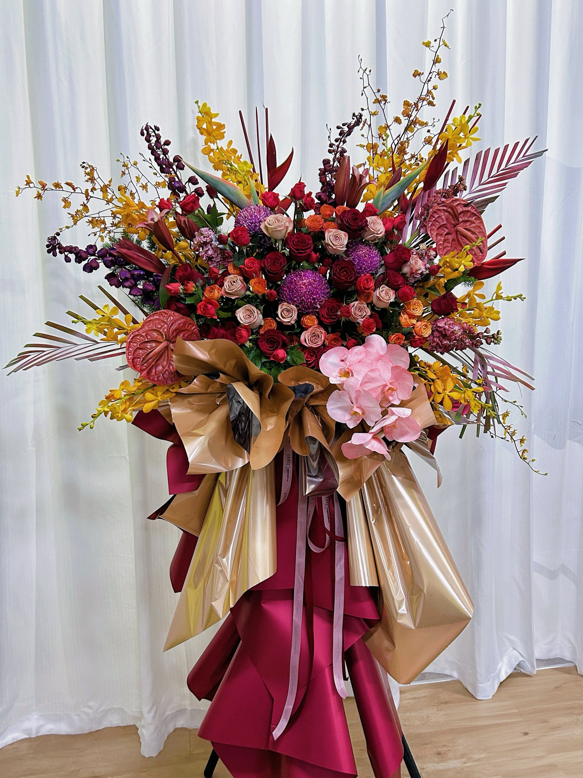 A statement grand opening flower stand designed to celebrate success, prosperity, and prestige.