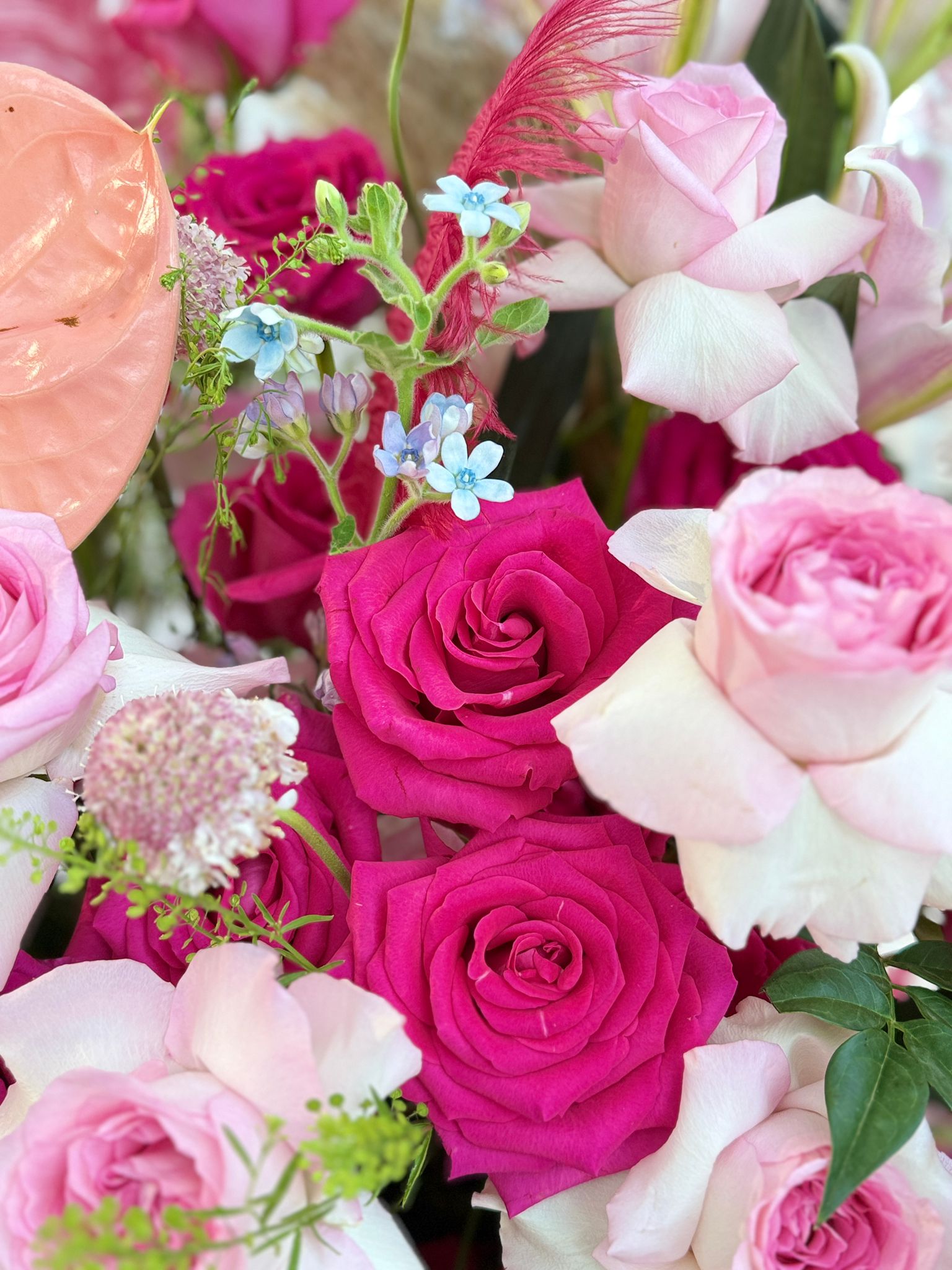 A heart full of dreams and devotion. This exquisite bouquet features a heart-shaped design of blue and white roses, symbolizing purity, sincerity, and everlasting love. Wrapped in soft white layers with pearl accents, it radiates elegance and romance. Perfect for proposals, anniversaries, or simply to say “you are my one and only.”• Main Flowers: White Roses• Shape: Heart-shaped romantic design• Style: Elegant, dreamy, and timeless• Suitable For: Proposal, Anniversary, Valentine’s Day, Romantic SurprisesAll fresh flowers and foliage are seasonal and may be substituted with similar varieties of equal or greater value. Each arrangement is uniquely handcrafted and may vary slightly from the display photo.