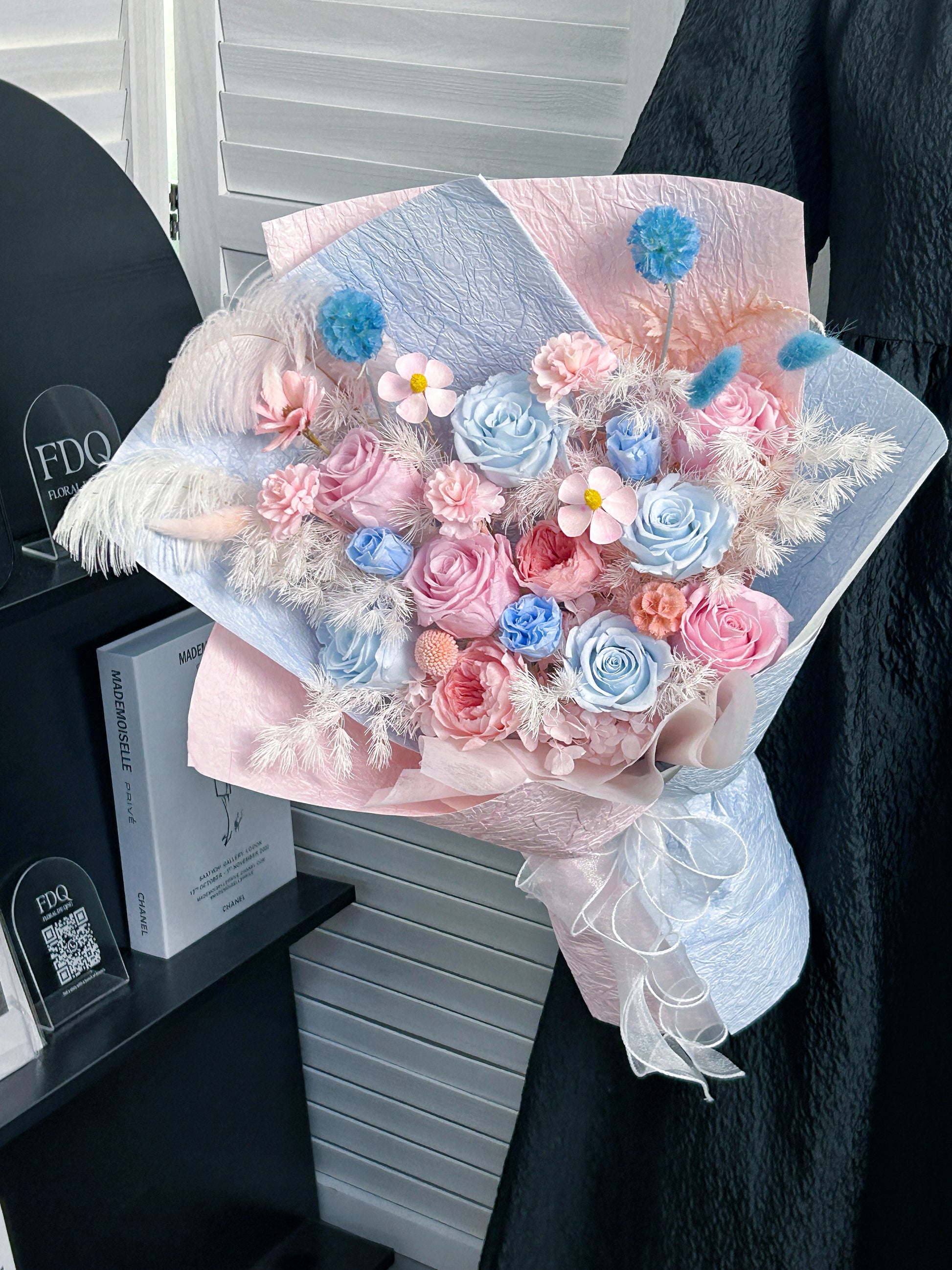This preserved flower bouquet features a soothing blend of baby blue, blush pink, soft peach, and ivory tones, creating a dreamy pastel harmony. Accented with airy white foliage and wrapped in layered pastel blue and pink paper, the bouquet feels light, gentle, and timeless.