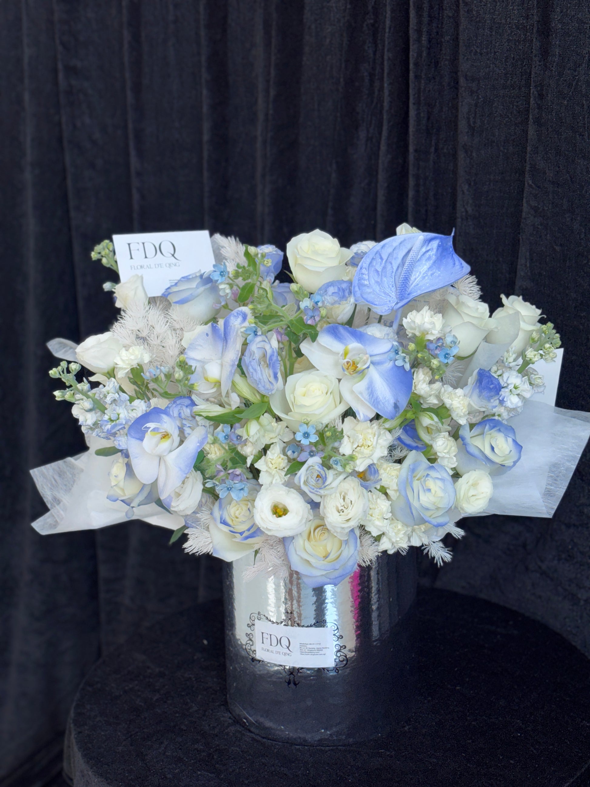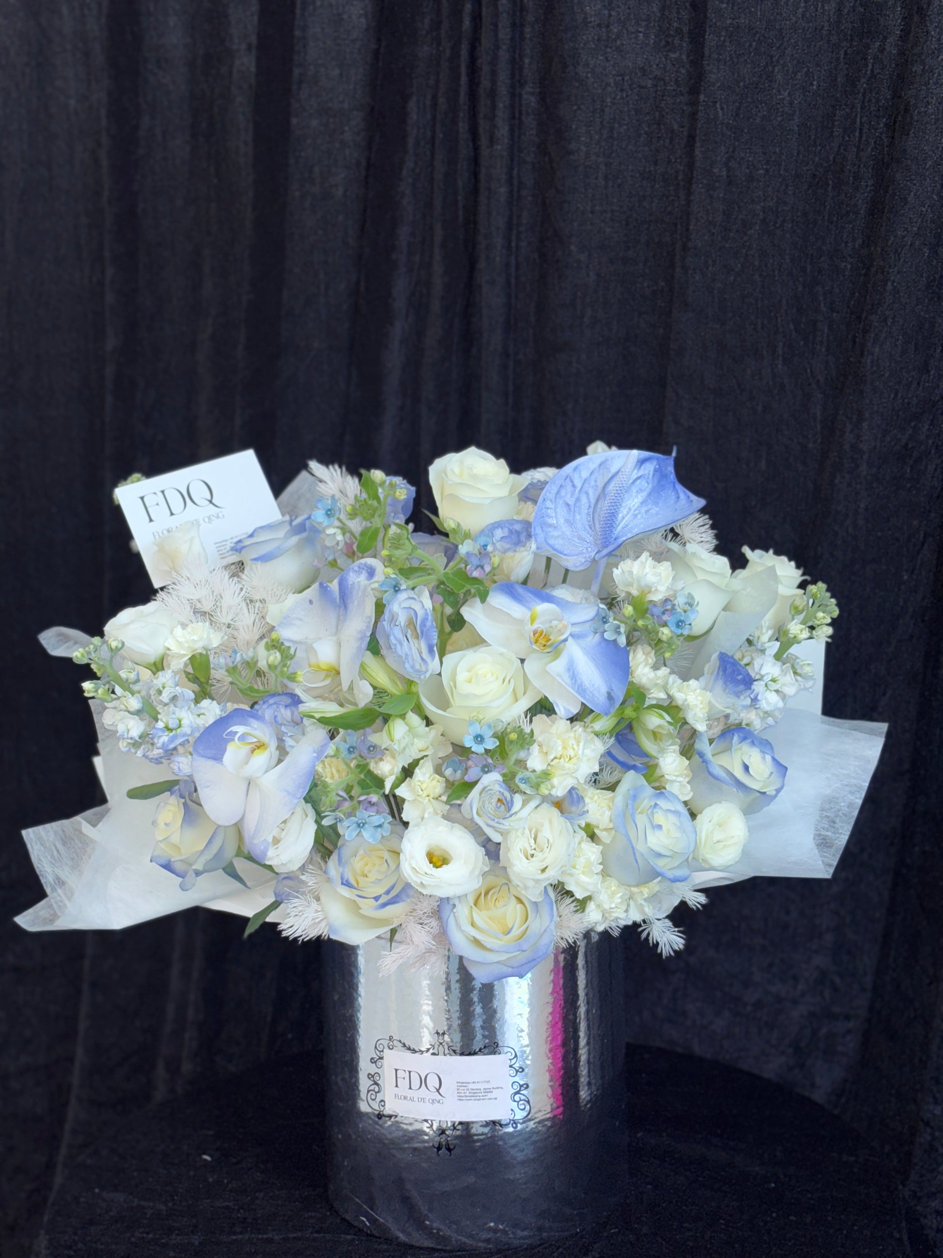A heart full of dreams and devotion. This exquisite bouquet features a heart-shaped design of blue and white roses, symbolizing purity, sincerity, and everlasting love. Wrapped in soft white layers with pearl accents, it radiates elegance and romance. Perfect for proposals, anniversaries, or simply to say “you are my one and only.”• Main Flowers: White Roses• Shape: Heart-shaped romantic design• Style: Elegant, dreamy, and timeless• Suitable For: Proposal, Anniversary, Valentine’s Day, Romantic SurprisesAll fresh flowers and foliage are seasonal and may be substituted with similar varieties of equal or greater value. Each arrangement is uniquely handcrafted and may vary slightly from the display photo.