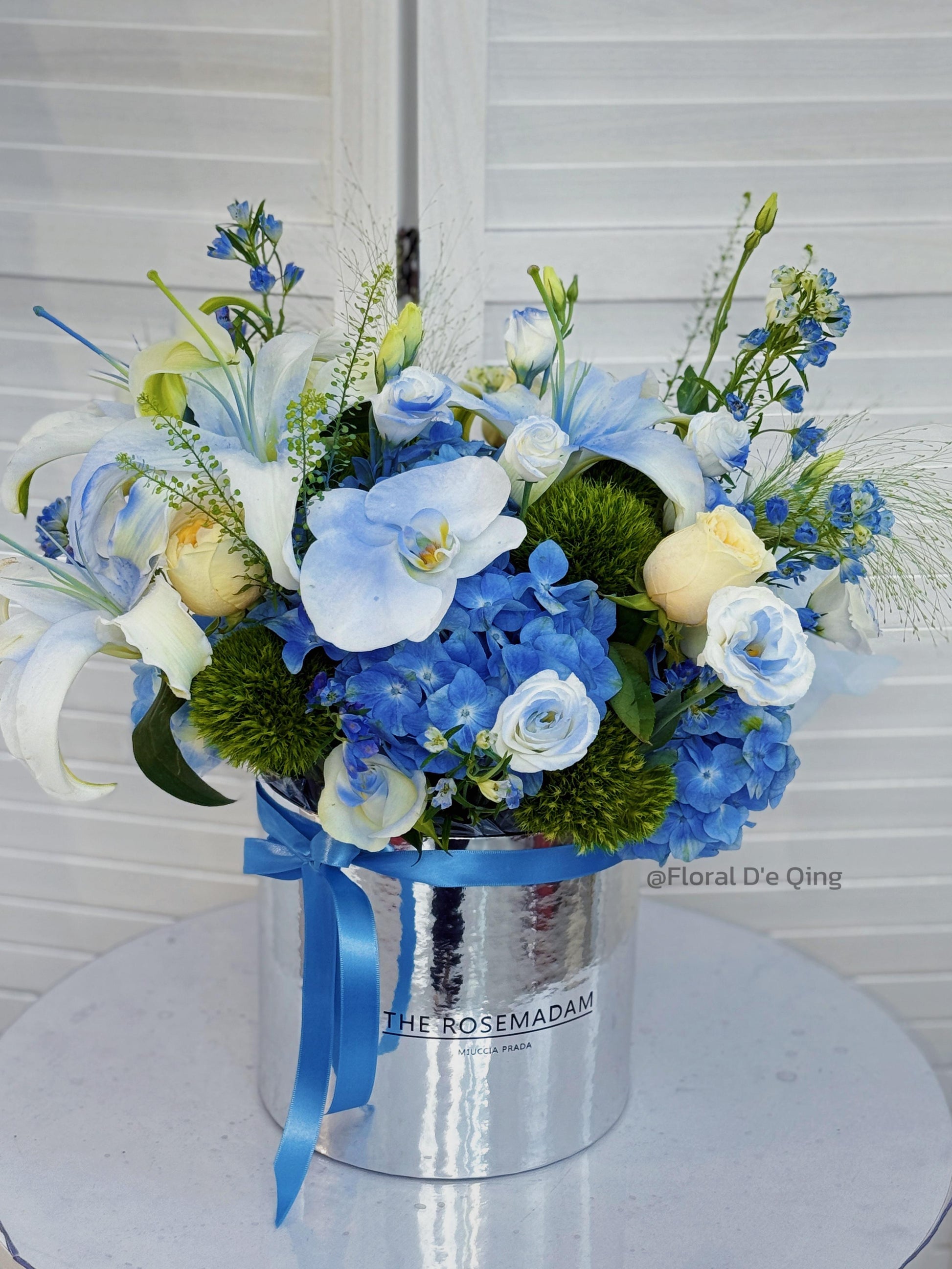 A heart full of dreams and devotion. This exquisite bouquet features a heart-shaped design of blue and white roses, symbolizing purity, sincerity, and everlasting love. Wrapped in soft white layers with pearl accents, it radiates elegance and romance. Perfect for proposals, anniversaries, or simply to say “you are my one and only.”• Main Flowers: White Roses• Shape: Heart-shaped romantic design• Style: Elegant, dreamy, and timeless• Suitable For: Proposal, Anniversary, Valentine’s Day, Romantic SurprisesAll fresh flowers and foliage are seasonal and may be substituted with similar varieties of equal or greater value. Each arrangement is uniquely handcrafted and may vary slightly from the display photo.