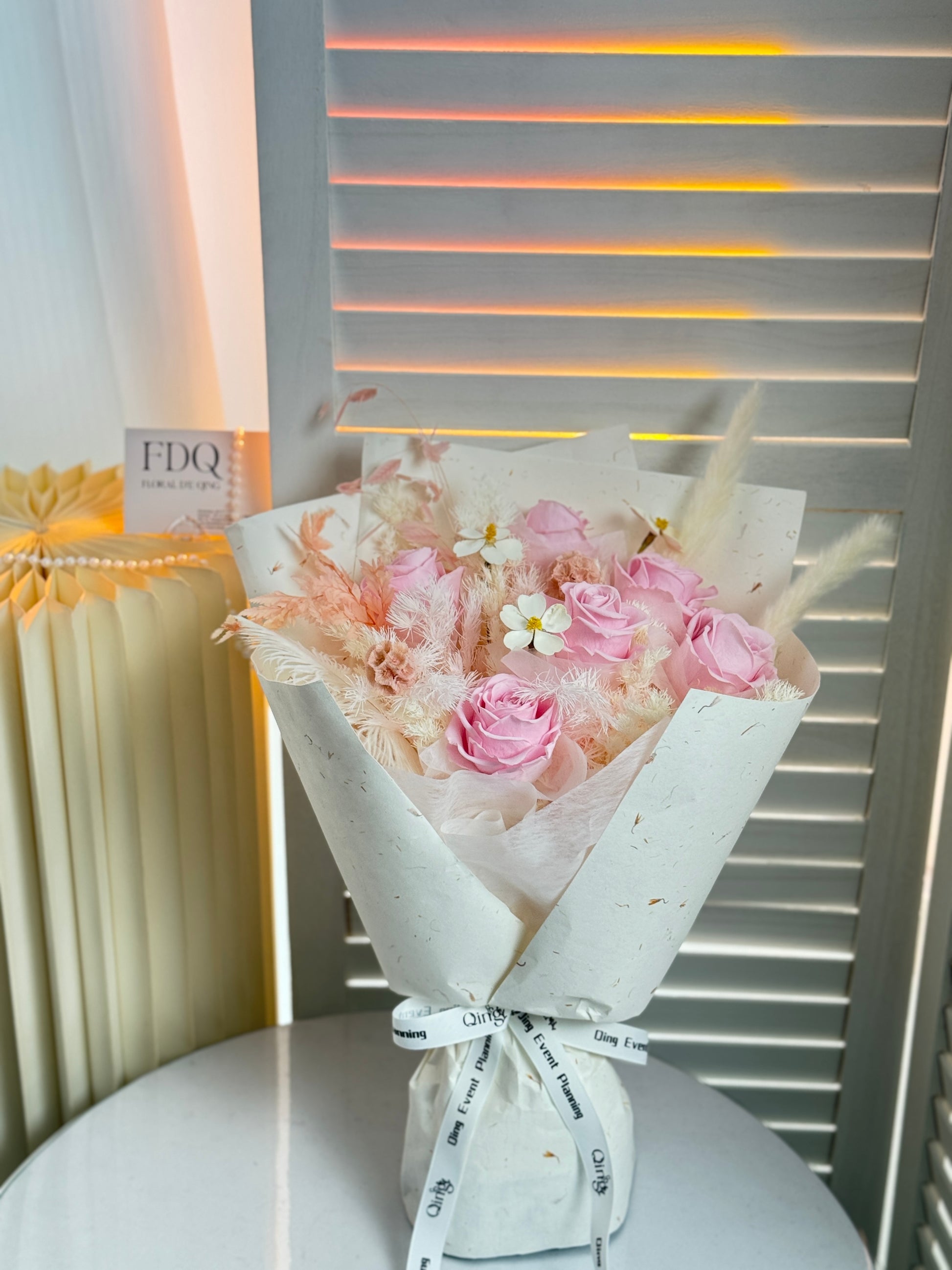 A heart full of dreams and devotion. This exquisite bouquet features a heart-shaped design of blue and white roses, symbolizing purity, sincerity, and everlasting love. Wrapped in soft white layers with pearl accents, it radiates elegance and romance. Perfect for proposals, anniversaries, or simply to say “you are my one and only.”• Main Flowers: White Roses• Shape: Heart-shaped romantic design• Style: Elegant, dreamy, and timeless• Suitable For: Proposal, Anniversary, Valentine’s Day, Romantic SurprisesAll fresh flowers and foliage are seasonal and may be substituted with similar varieties of equal or greater value. Each arrangement is uniquely handcrafted and may vary slightly from the display photo.