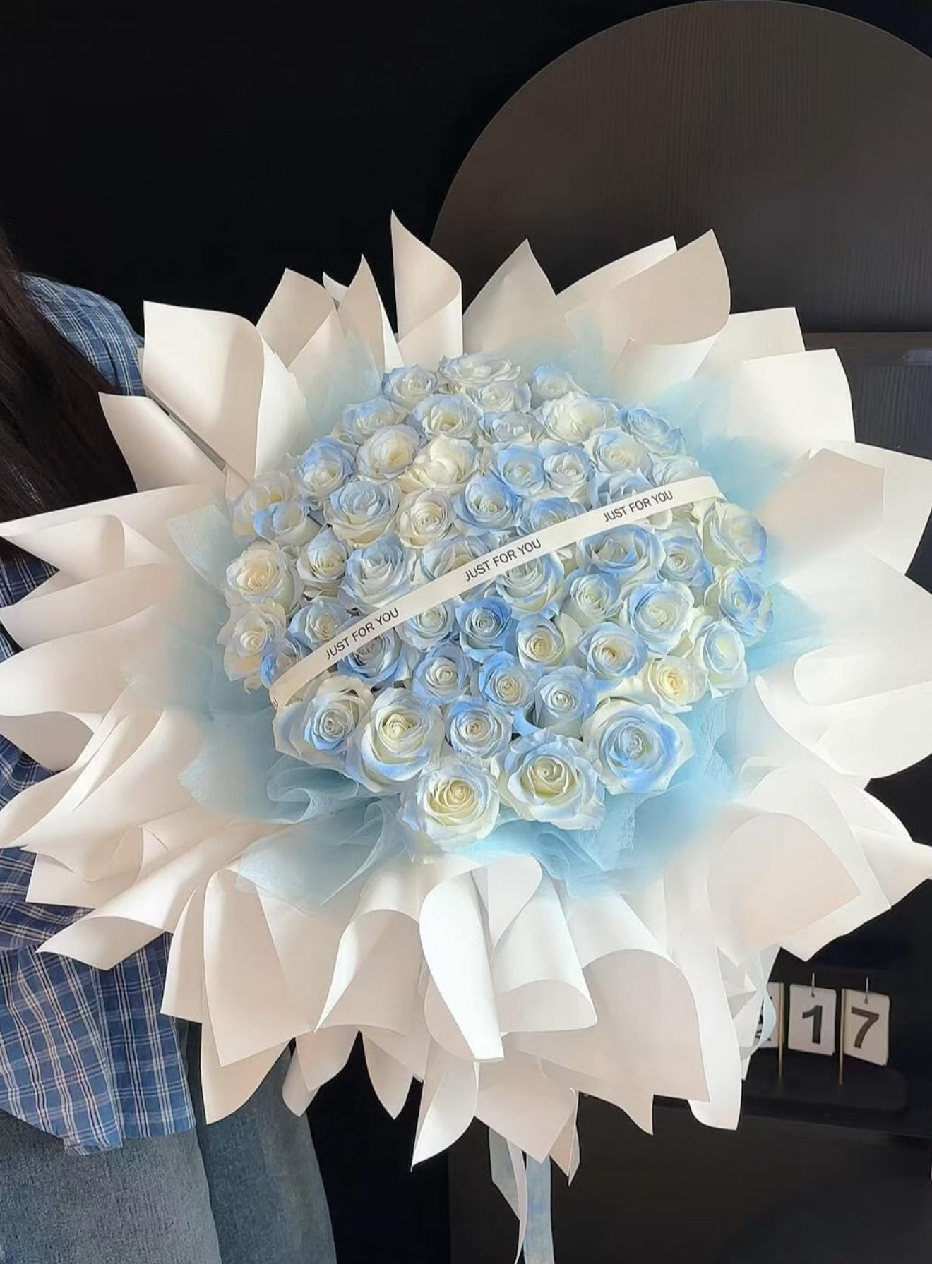 A heart full of dreams and devotion. This exquisite bouquet features a heart-shaped design of blue and white roses, symbolizing purity, sincerity, and everlasting love. Wrapped in soft white layers with pearl accents, it radiates elegance and romance. Perfect for proposals, anniversaries, or simply to say “you are my one and only.”• Main Flowers: White Roses• Shape: Heart-shaped romantic design• Style: Elegant, dreamy, and timeless• Suitable For: Proposal, Anniversary, Valentine’s Day, Romantic SurprisesAll fresh flowers and foliage are seasonal and may be substituted with similar varieties of equal or greater value. Each arrangement is uniquely handcrafted and may vary slightly from the display photo.