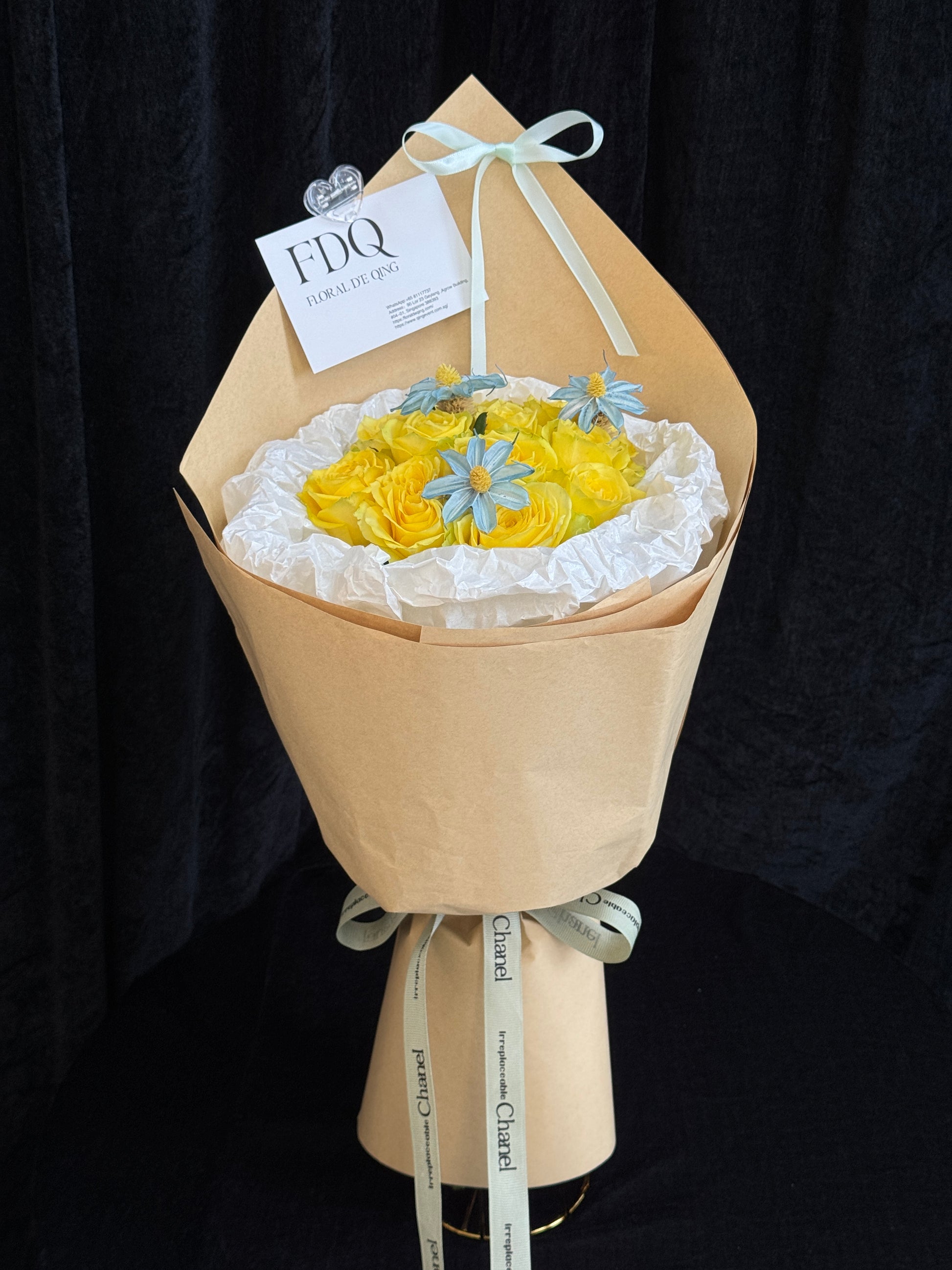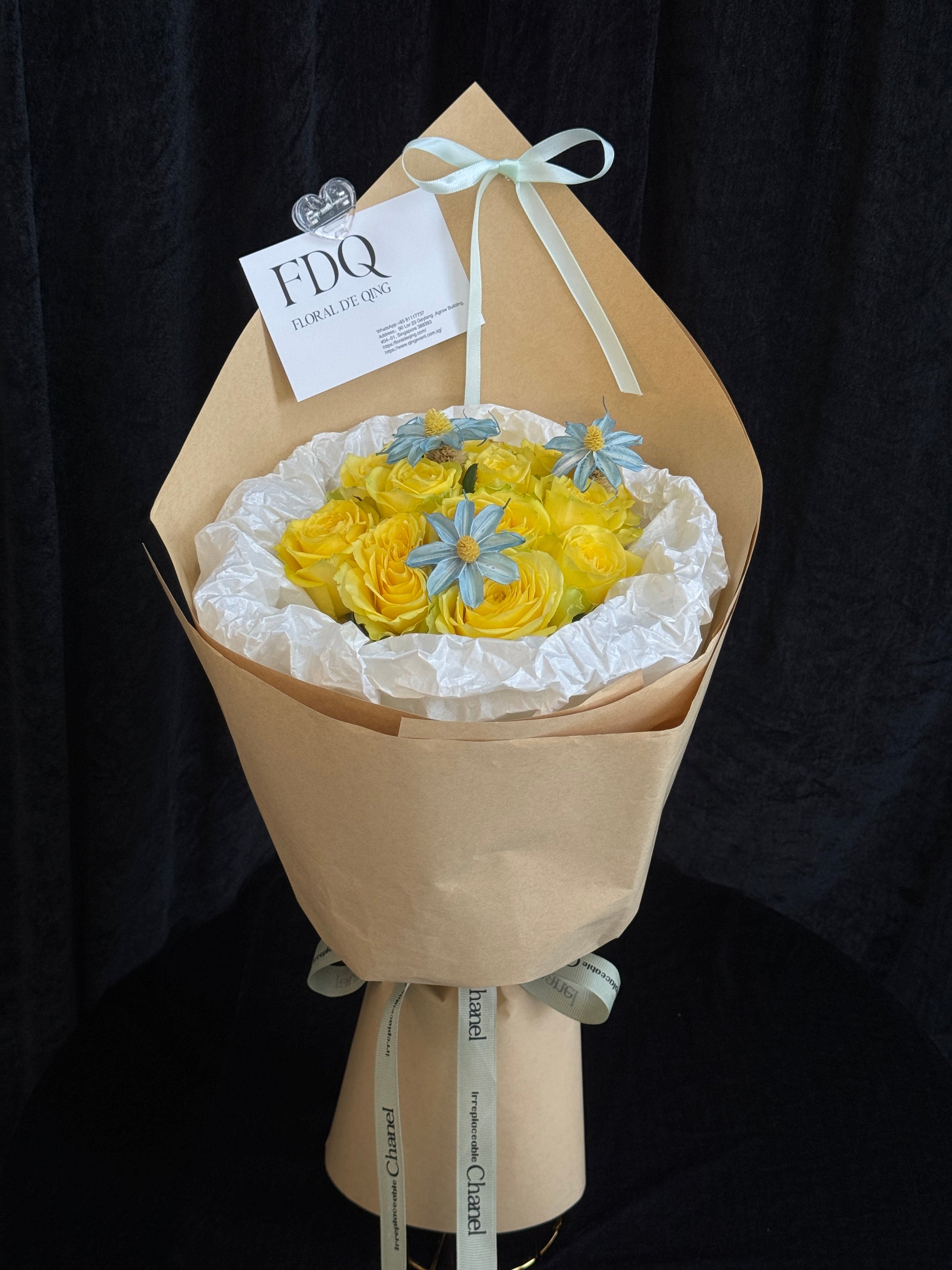 A heart full of dreams and devotion. This exquisite bouquet features a heart-shaped design of blue and white roses, symbolizing purity, sincerity, and everlasting love. Wrapped in soft white layers with pearl accents, it radiates elegance and romance. Perfect for proposals, anniversaries, or simply to say “you are my one and only.”• Main Flowers: White Roses• Shape: Heart-shaped romantic design• Style: Elegant, dreamy, and timeless• Suitable For: Proposal, Anniversary, Valentine’s Day, Romantic SurprisesAll fresh flowers and foliage are seasonal and may be substituted with similar varieties of equal or greater value. Each arrangement is uniquely handcrafted and may vary slightly from the display photo.